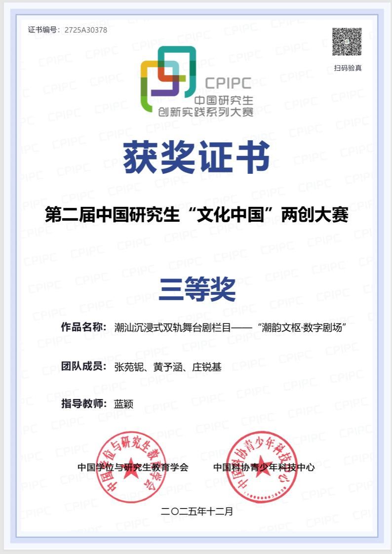此前,我院戏剧与影视专业硕士研究生主创的其他3部作品已在本届大赛中获得三等奖,分别是唐铭杰创作的话剧《莲姑的夜》,陈澄、杜泽南、肖亦夫、吴晓阳、马晓斐等共同创作的教育戏剧《一碗粥里的城市心跳》,以及张苑铌、黄予涵合作的潮汕沉浸式双轨舞台剧栏目“潮韵文枢·数字剧场”,充分展现了戏剧与影视专业研究生扎实的专业功底,以及在中华优秀传统文化的创造性转化和创新性发展上做出的可贵探索。