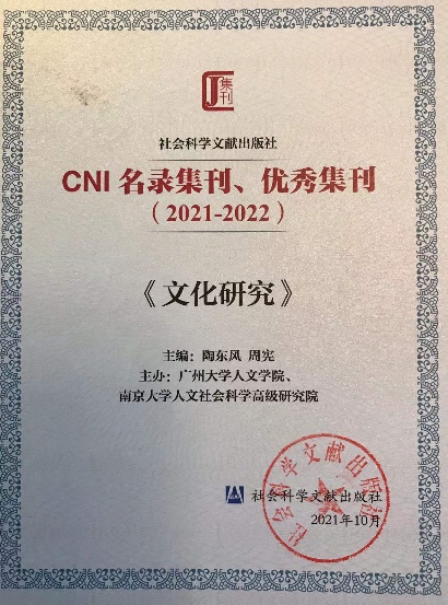 社会科学文献出版社于日前发布了2021-2022年度“CNI名录集刊、优秀集刊”名单,由我院陶东风教授与南京大学社会科学高级研究院周宪教授联合主编的《文化研究》再次入选该名录,并再次荣获优秀集刊称号。